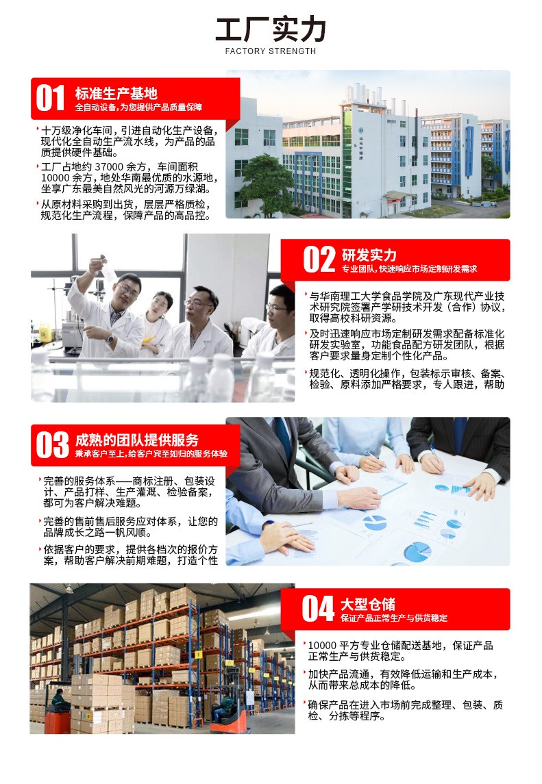 集團(tuán)公司擁有藥學(xué)、食品工程及相關(guān)專業(yè)工程師20多人,華南理工、南方醫(yī)大、中山大學(xué)、暨南大學(xué)、廣東藥科大學(xué)、新疆醫(yī)科大學(xué)等特聘專家博士10多人,運(yùn)營設(shè)計(jì)團(tuán)隊(duì)10余人,專業(yè)銷售人員30余人,專業(yè)生產(chǎn)技術(shù)工人200多人,各型生產(chǎn)線60+條,大健康產(chǎn)品成熟配方10000+,市場暢銷產(chǎn)品100+,亦可按客戶要求設(shè)計(jì)、優(yōu)化產(chǎn)品配方,全力助合作伙伴事業(yè)騰飛!