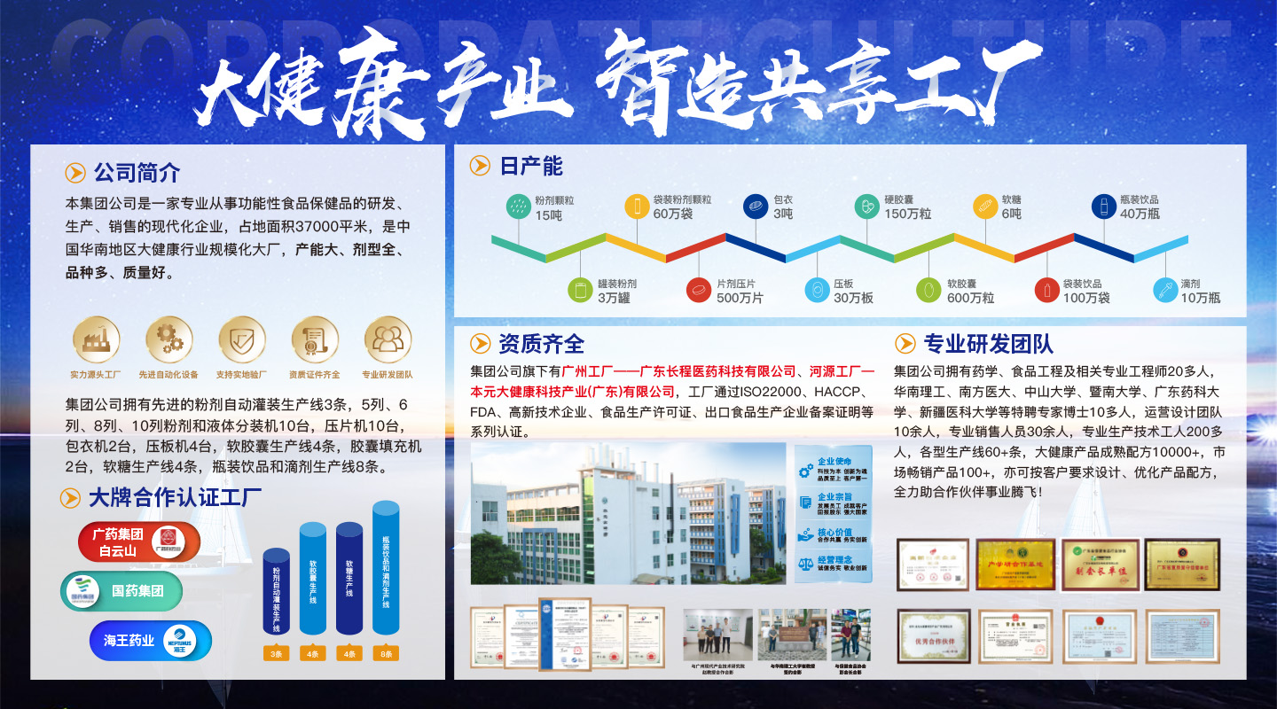 本元大健康集團(tuán)公司是一家專業(yè)從事功能性食品保健品的研發(fā)、生產(chǎn)、銷售的現(xiàn)代化企業(yè),旗下有廣州工廠--廣東長程醫(yī)藥生物科技有限公司和河源工廠--本元大健康科技產(chǎn)業(yè)(廣東)有限公司,總占地面積37000平米,是中國華南地區(qū)大健康行業(yè)規(guī);髲S,產(chǎn)能大、劑型全、品種多、質(zhì)量好。