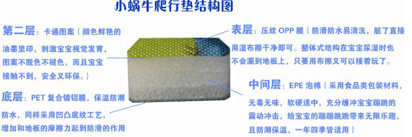 小蝸牛爬行墊無毒無味,防潮隔濕,超大無縫,表面附帶精美的童話圖案,從寶寶學(xué)爬到練習(xí)走路,再到大點(diǎn)在地上玩耍蹦跳,都是不錯(cuò)的選擇,是寶寶健康快樂成長(zhǎng)的好伴侶。