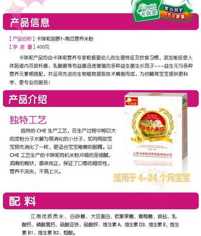 卡咪呢有機(jī)米粉系列是專為中國寶寶設(shè)計(jì)的營養(yǎng)輔食,選用有機(jī)大米,科學(xué)搭配維生素AD等維生素,還特別添加牛磺酸、DHA、AA等有助智力發(fā)育的營養(yǎng)成分,富含15種營養(yǎng)素,F(xiàn)上?ㄟ淠啬笅胗闷酚邢薰久嫦蛉珖瞻资袌鰠^(qū)域誠招卡咪呢有機(jī)米粉代理商。