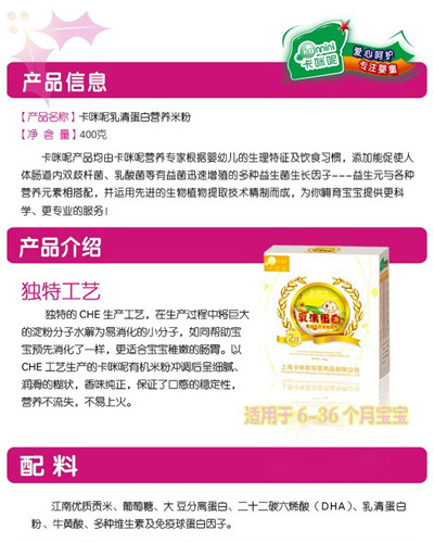 卡咪呢乳清蛋白嬰幼兒營養(yǎng)米粉是上?ㄟ淠啬笅胗闷酚邢薰酒煜庐a(chǎn)品,精選優(yōu)質(zhì)大米制作,特別添加乳清蛋白和益生元,提高寶寶抵抗力,促進(jìn)寶寶changdao的消化吸收,上市以來廣受父母消費(fèi)者的青睞。