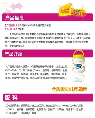 卡咪呢有機(jī)米粉系列是專為中國(guó)寶寶設(shè)計(jì)的營(yíng)養(yǎng)輔食,選用有機(jī)大米,科學(xué)搭配維生素AD等維生素,還特別添加;撬、DHA、AA等有助智力發(fā)育的營(yíng)養(yǎng)成分,富含15種營(yíng)養(yǎng)素。現(xiàn)上?ㄟ淠啬笅胗闷酚邢薰久嫦蛉珖(guó)空白市場(chǎng)區(qū)域誠招卡咪呢有機(jī)米粉代理商。