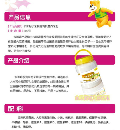卡咪呢有機(jī)米粉系列是專為中國寶寶設(shè)計的營養(yǎng)輔食,選用有機(jī)大米,科學(xué)搭配維生素AD等維生素,還特別添加;撬、DHA、AA等有助智力發(fā)育的營養(yǎng)成分,富含15種營養(yǎng)素,F(xiàn)上海卡咪呢母嬰用品有限公司面向全國空白市場區(qū)域誠招卡咪呢有機(jī)米粉代理商。