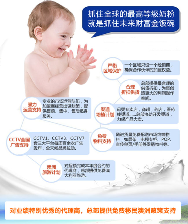品牌名稱:澳特佳 主營產品:澳特佳嬰兒奶粉招商 品牌特色:天然 安全 不上火