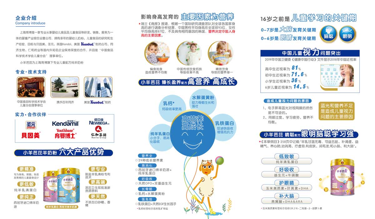 小羊芭芘為上海育博旗下專業(yè)兒童配方純羊奶粉,它是一家專業(yè)從事嬰幼兒食品及兒童食品等研發(fā)、銷售、服務為一體的嬰童產業(yè)綜合運營公司,擁有多年的嬰幼兒奶粉、兒童食品的研究和生產經(jīng)驗,目前與貝因美、圣元、英國Kendal、 美國YunboL制藥公司、同濟生物、仁和藥業(yè)等國內外知名企業(yè)保持深度的合作,并且是“中國食品科學技術學會兒童分會”理事單位。