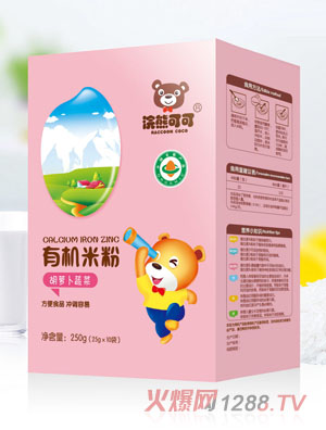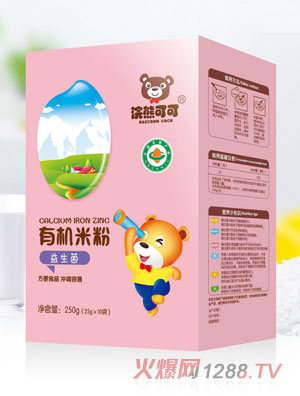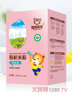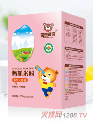 浣熊可可有機米粉,精選有機大米為主要原料,特別添加乳清蛋白、益生菌、益生元,更強化了多種礦物質和維生素,尤其是鈣、鐵、鋅等,保證了成長所需。