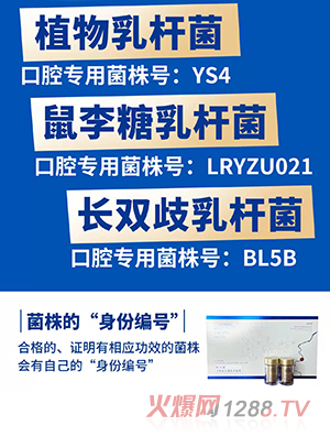 第一“專菌專用”,是腔億菌從百萬計的益生菌大家族中,首次發(fā)現(xiàn)并分離培育出了 針對口腔癥狀的三種菌株,它們的菌株號分別為:植物乳桿菌中的KLDS1001菌株;鼠李糖乳桿菌家族的LRYZU021;長雙歧乳桿菌中的BL5b菌株;大家可不要小看這帶字母的菌株號,這就相當于我們每個人的唯一身份證。