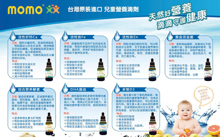 momo營養(yǎng)素滴劑系列,100%臺灣原罐原裝,正規(guī)進(jìn)口食品,安全有保障。臺灣專業(yè)研發(fā)團(tuán)隊(duì),采用本土原材料,采用嚴(yán)格的自我生產(chǎn)管理系統(tǒng),從 產(chǎn)品開發(fā)、原來生產(chǎn)到末端產(chǎn)品的包裝,提供完整的品質(zhì)服務(wù)。現(xiàn)正面向全國招商中,有意向者現(xiàn)在就可以通過火爆嬰童網(wǎng)進(jìn)行留言咨詢。