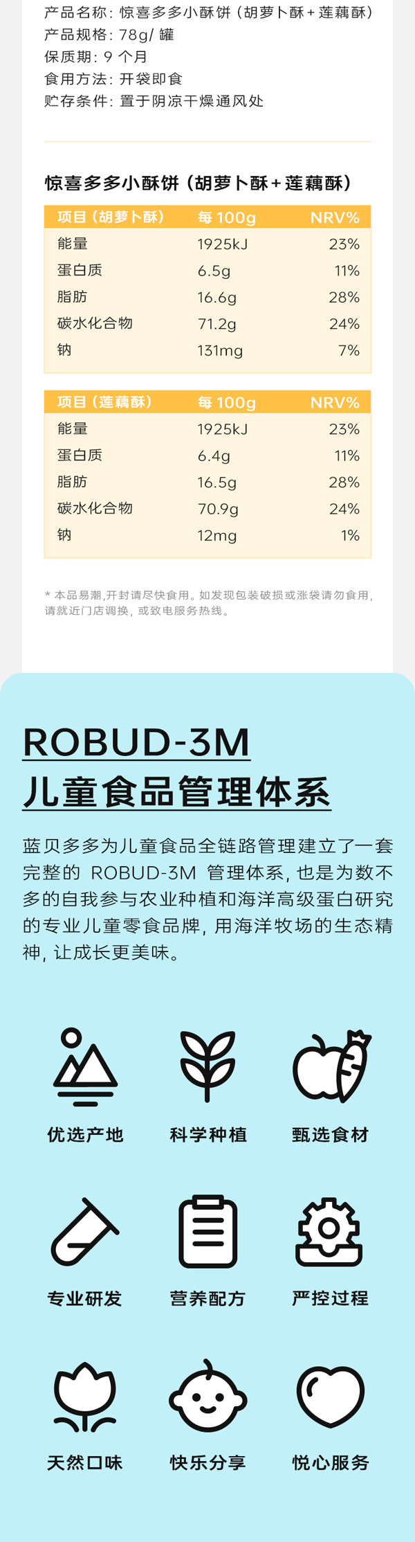 藍貝多多驚喜多多小酥餅(胡蘿卜酥+蓮藕酥),添加蓮藕&胡蘿卜,拒絕多余添加,雙拼口味,雙重滿足,低溫烘焙, 非油炸,保留食材中的營養(yǎng)成分,鎖住食材色香味,海藻糖更益牙,不會引起齲齒,獨立小包,定時定量。